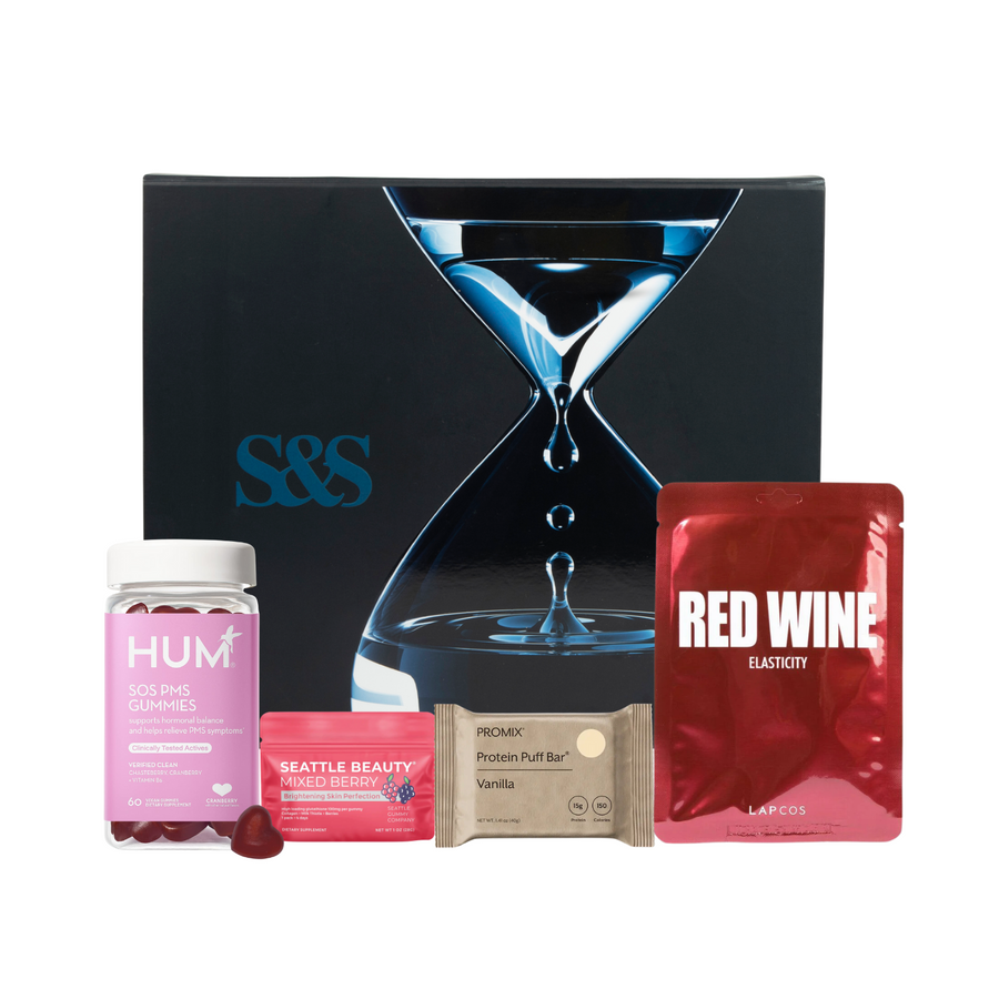 The PMS Box is your ultimate companion for that time of the month, offering comfort, relief, and a touch of indulgence. This thoughtfully curated box includes HUM Nutrition SOS PMS Gummies to alleviate PMS symptoms, Seattle Gummy Company's Mixed Berry Skin Perfection Gummies for radiant skin, and a luxurious LAPCOS Sheet Mask for a rejuvenating experience. Treat yourself to a delicious Promix Puff Bar and embrace your cycle with care and comfort.